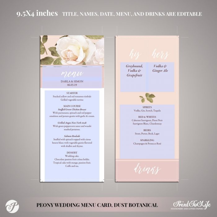 Purchase this Peony Wedding Menu Template, coordinated with the Dusty Pink Botanical Collection, that prints nicely on rustic or special coated papers. It comes in 4″x9.5, for home printing or at your local copy shop. Files are available instantly after your payment is complete.