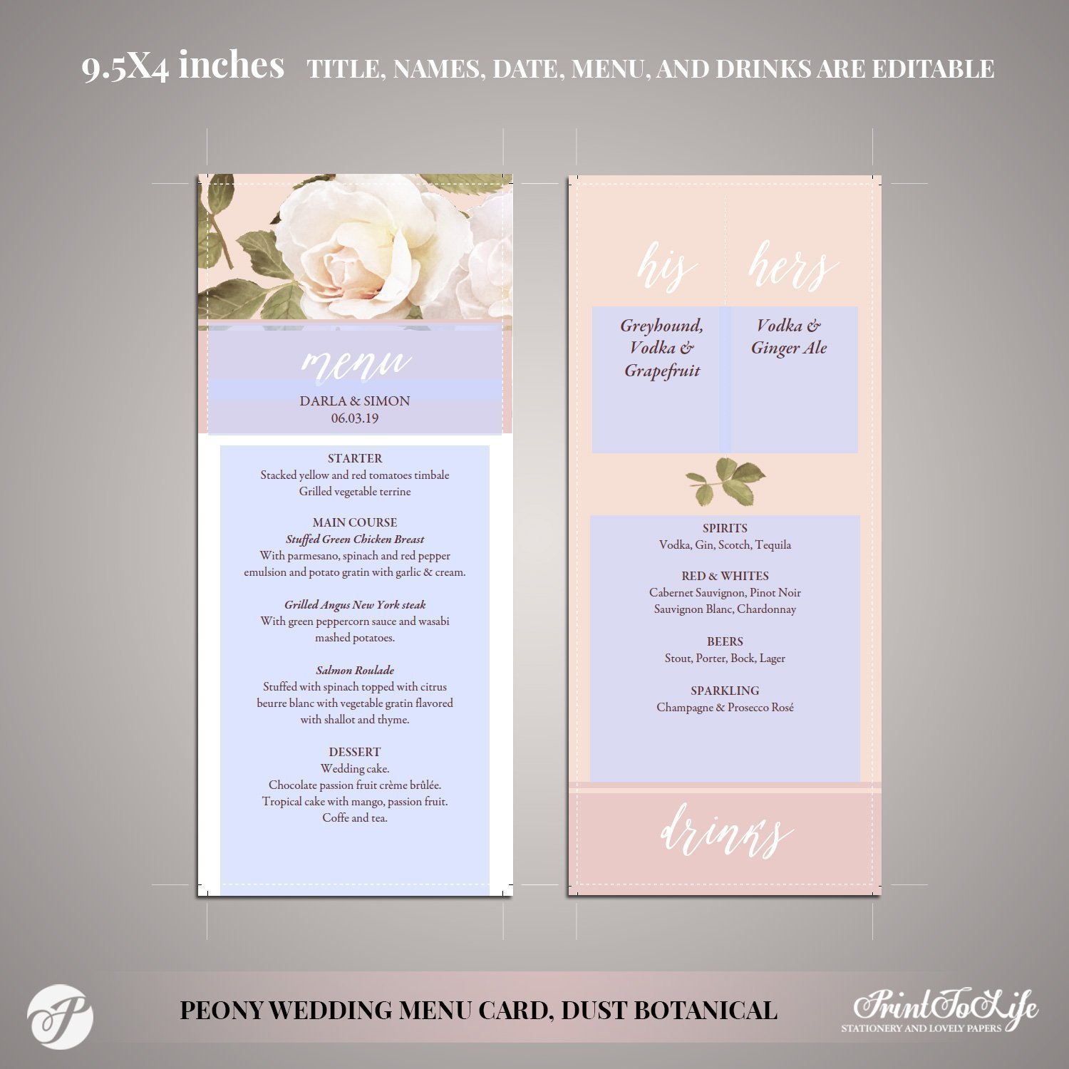 Peony Wedding Menu Template, Food & Drinks #Dusty Pink Botanical Collection